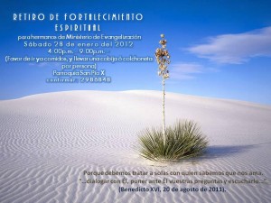 Este sábado28 de enero, se lleva a cabo el retiro de fortalecimiento para el ministerio de evangelización de la parroquia de San Pío X; el horario será de 4.00 pm a 9.00 pm deseando que como su nombre lo dice estreche la relación de manera integral de sus miembros.