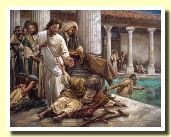 y bajo los pórticos yacía una multitud de enfermos, ciegos, cojos, tullidos (y paralíticos. Todos esperaban que el agua se agitara,