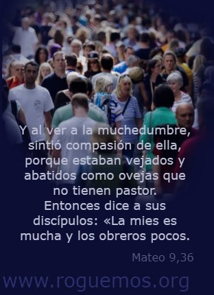 Jesús recorría todas las ciudades y los pueblos, enseñando en las sinagogas, predicando el Evangelio del Reino y curando toda enfermedad y dolencia. Al ver a las multitudes, se compadecía de ellas, porque estaban extenuadas y desamparadas, como ovejas sin pastor. Entonces dijo a sus discípulos: “La cosecha es mucha y los trabajadores, pocos. Rueguen, por lo tanto, al dueño de la mies que envíe trabajadores a sus campos”.